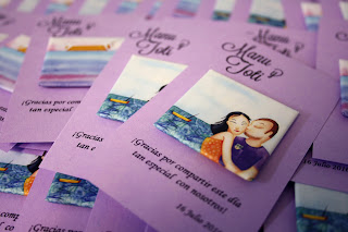 Un día tan especial te apetece compartirlo con las personas a las que más quieres. Para agradecerles su asistencia, Manu y Toti decidieron hacerles un regalo, en línea con la invitación de boda: Imanes ilustrados, en formato cuadrado para nevera, para que todos recordasen ese día inolvidable.